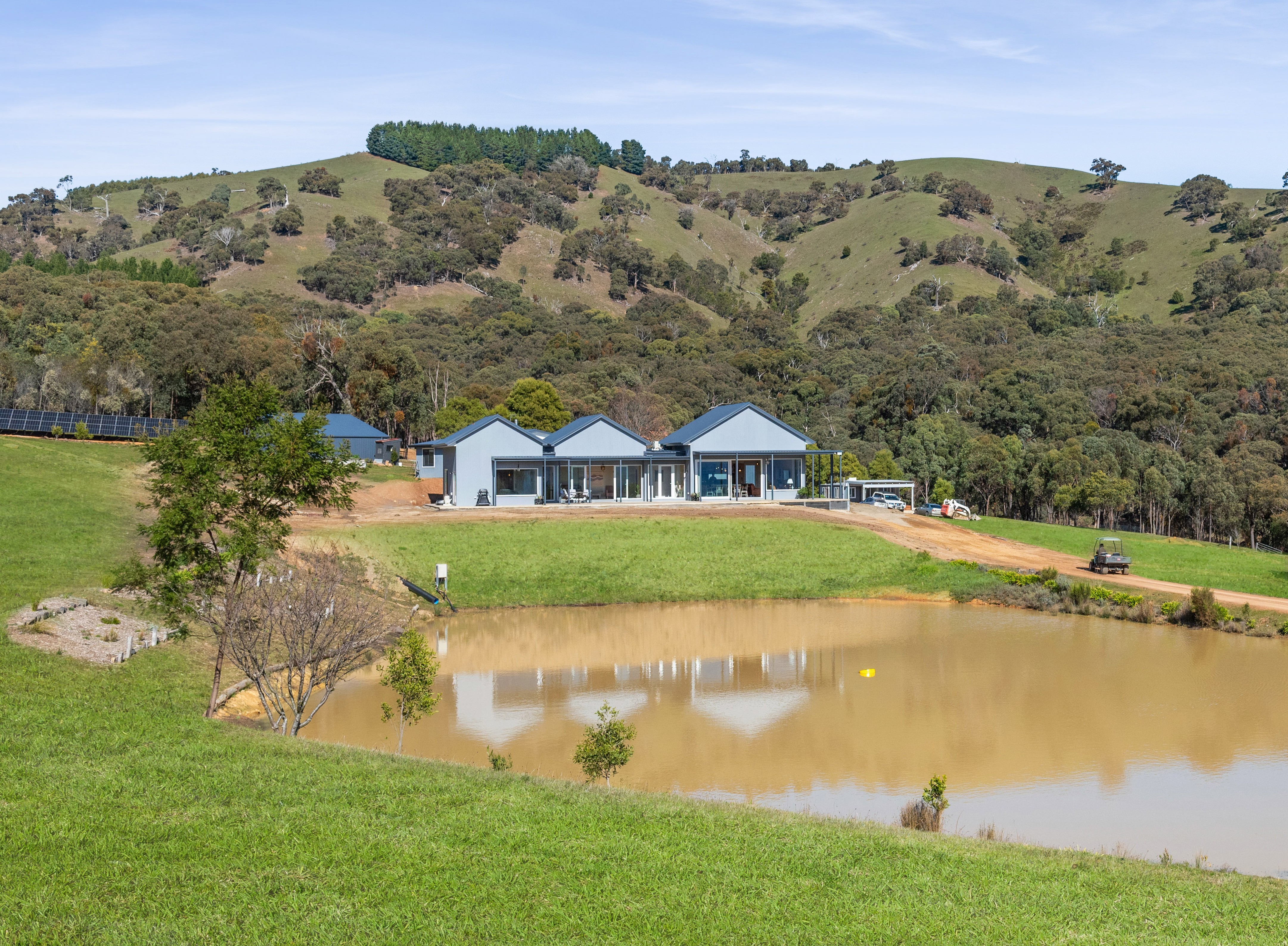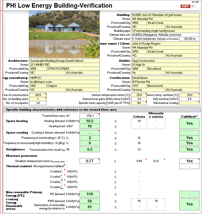 Various types of construction were investigated but ultimately the local builder preferred standard 90mm timber frame with SHD glasswool between the studs. To compensate, the roof has R10 glasswool which only adds a few thousand dollars over using Australian Code standard. The floor has a particleboard deck over insulation above the slab. Windows are double glazed Kommerling Upvc from Blue Sky. Due to the remoteness of the site, the house is totally off-grid.