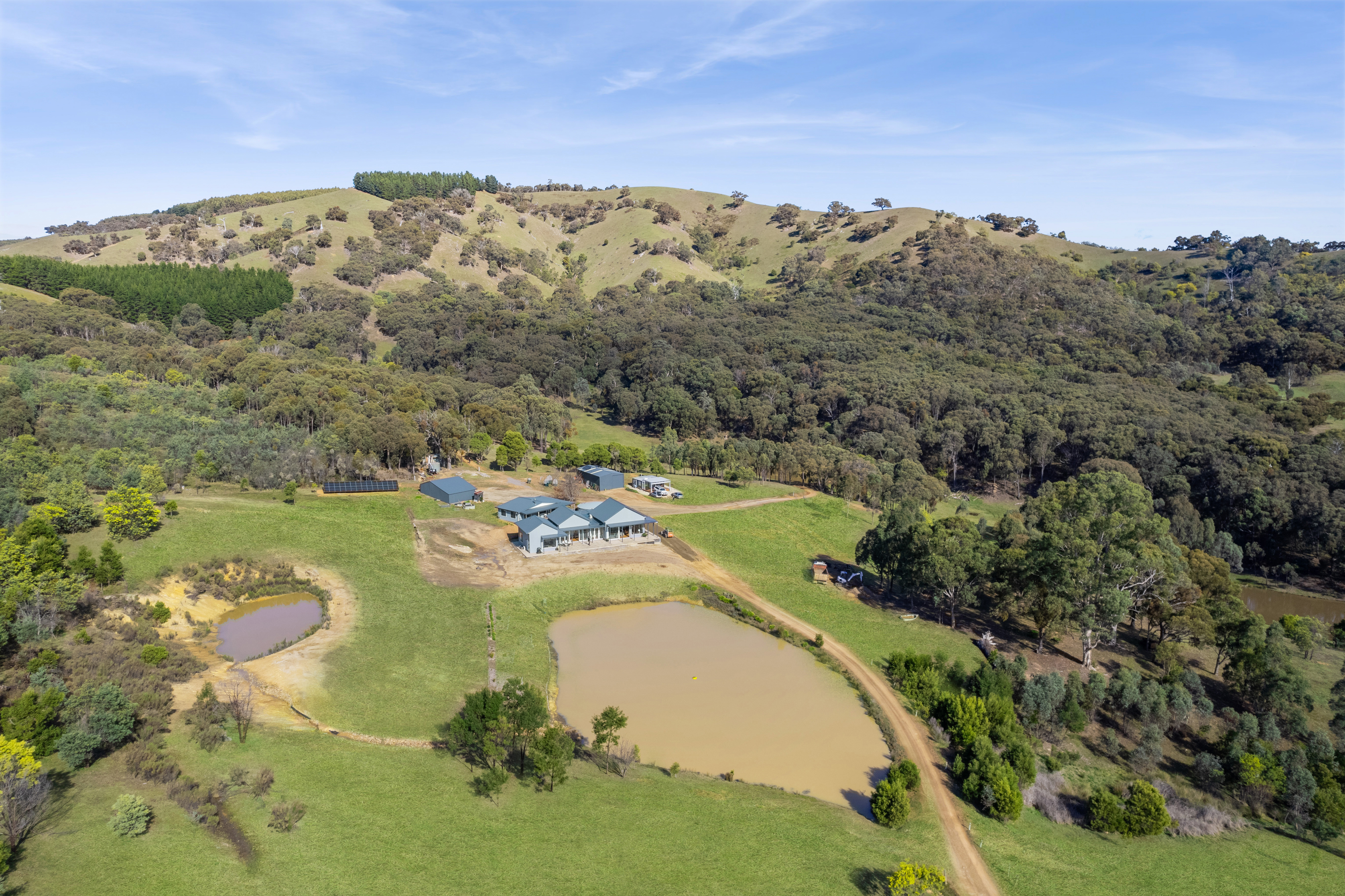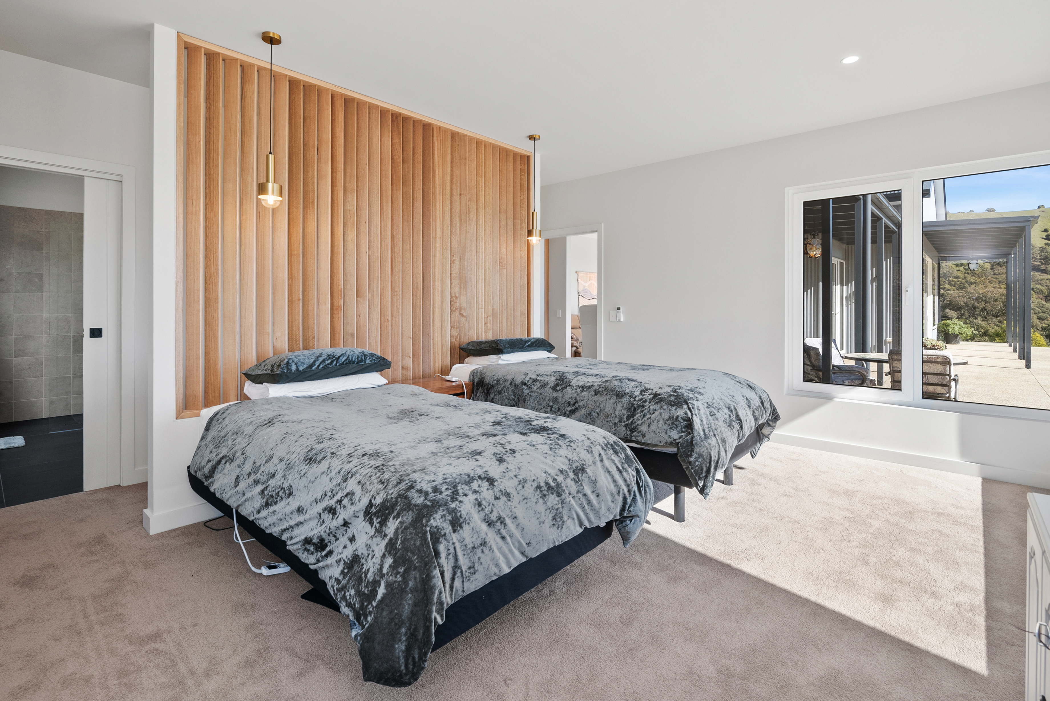 This rural house has very generous glazing to take in the views to surrounding hills. In addition to a large kitchen/ dining/ living area it has a Gallery for entertaining guests which opens on to a north facing court sheltered from south, east and west winds by the pavilion form of the building.