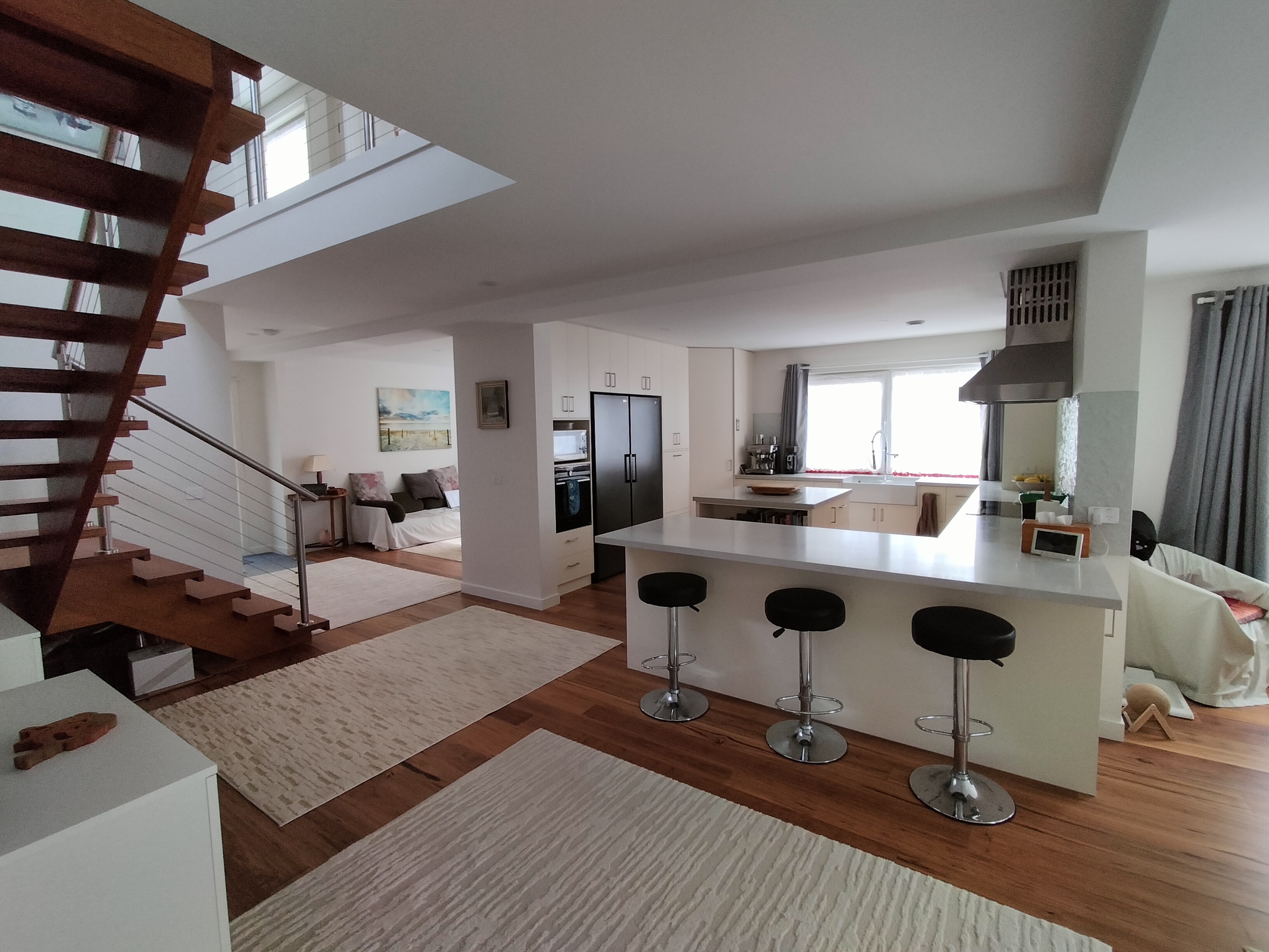 Although this is a suburban house it has a roof terrace providing views to the mountains. It has a west frontage to a busy road which is screened by large trees but also has a north frontage to a quiet side street. The main glazing therefore is orientated towards the sun. A low heating and cooling demand of 9 kWhr/m2/annum allows sufficient pv panels on the limited roof space to achieve Passivhaus Premium even though some panels face south.