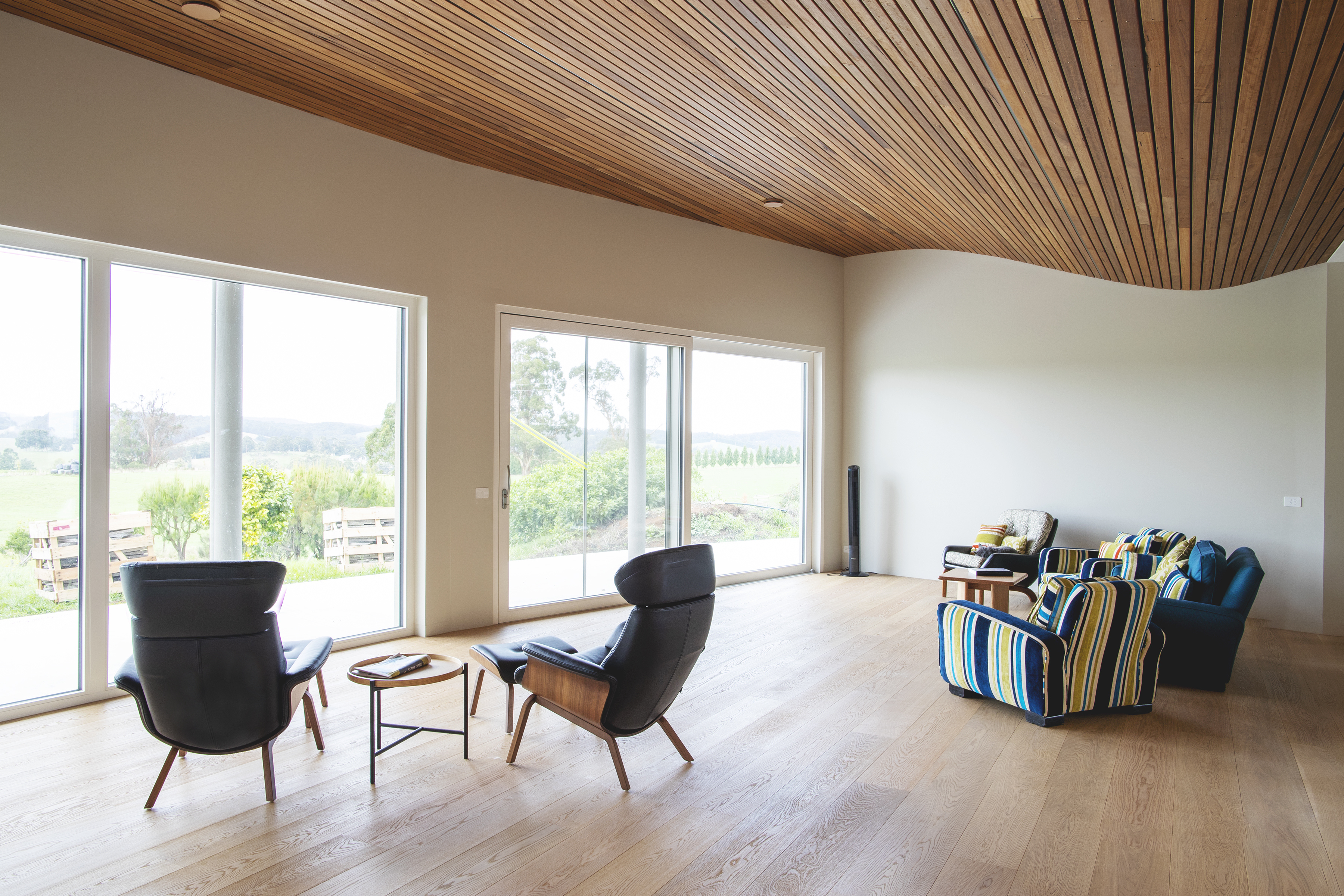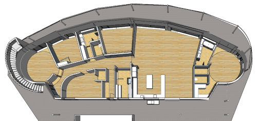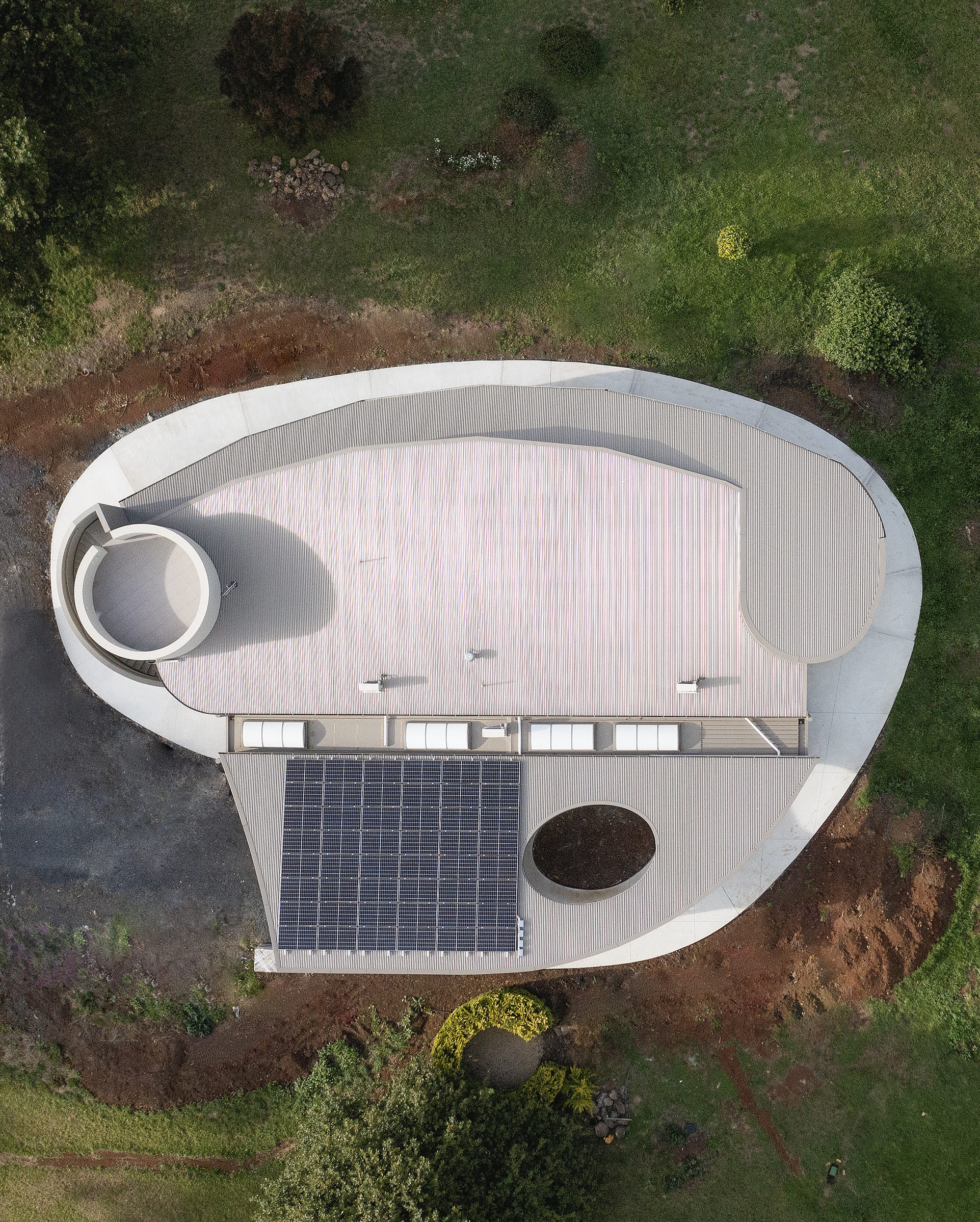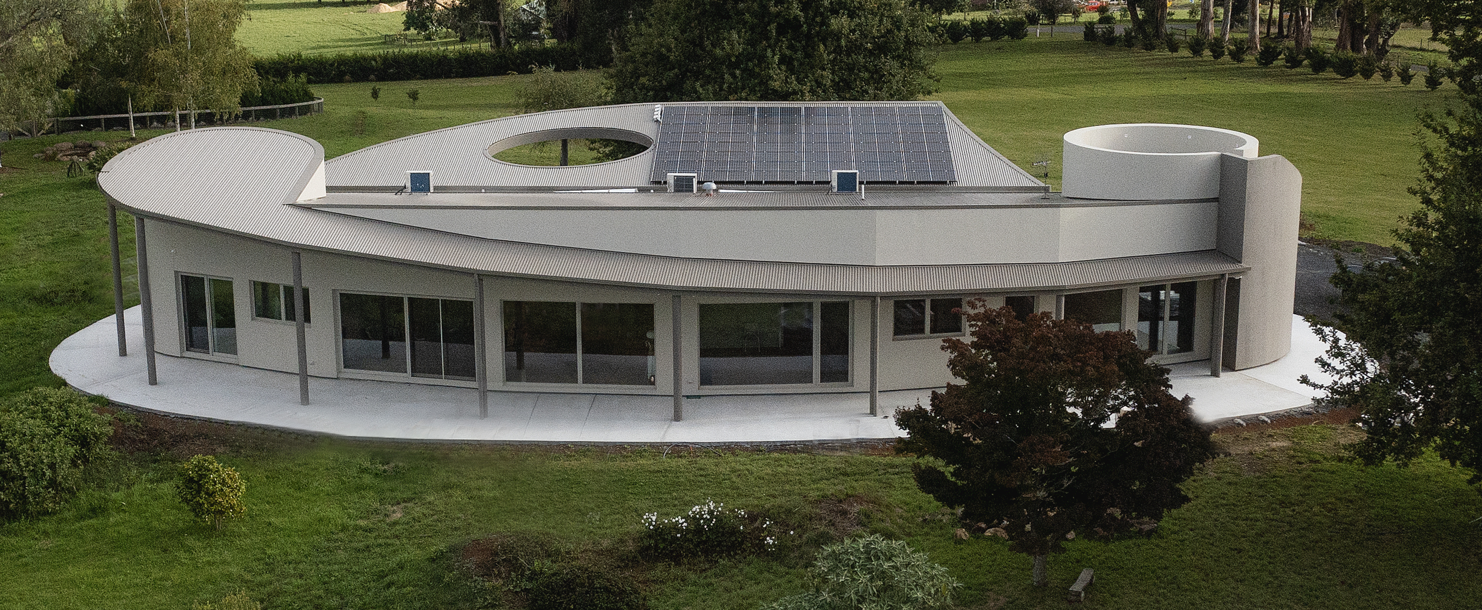 CasaCurvatura: The brief for a house with curves is satisfied with a curved plan, circular rooms, spiral stair to a circular star gazing turret, curved internal walls and a curved ceiling. The veranda canopy spirals around the curved walls and up over the main roof to become the roof of the eastern rotunda. This canopy expands in response to the solar exposure as the façade sweeps round to address the view. Despite these apparent complications, the geometry is carefully calculated and regular which has allowed the Panellite prefabricated panel system for walls and roof to be manufactured off site from the CAD drawings and installed without a hitch. The pv array with batteries makes the house energy self-sufficient. Winner of two national awards. It also meets Liveable Housing Standard and Bushfire requirements.