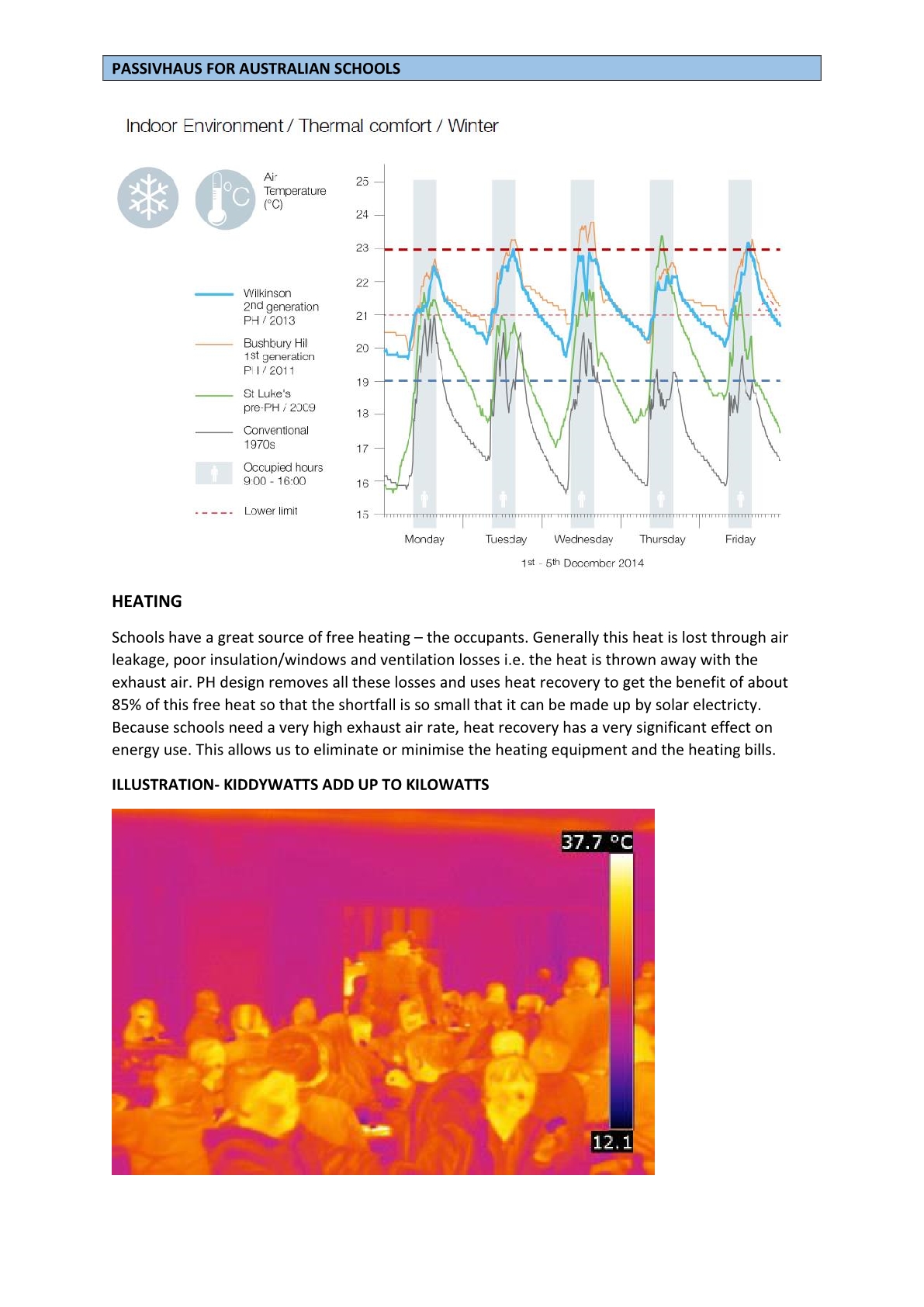 Because a school is only used during the day and has a high density of occupants producing heat, the design just has to prevent this heat being lost to achieve the very low energy demand. Adequate shading and insulation keep unwanted heat out.