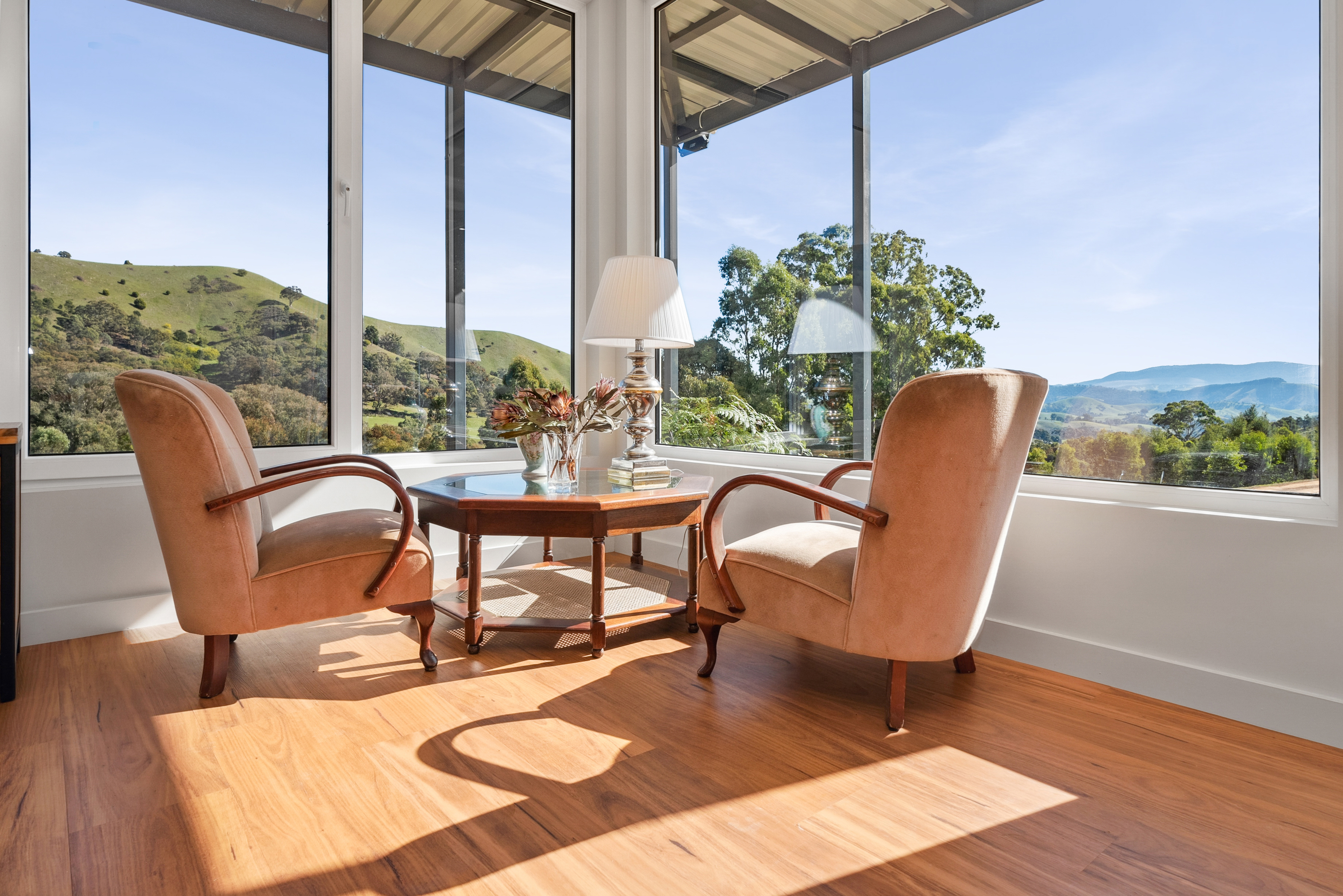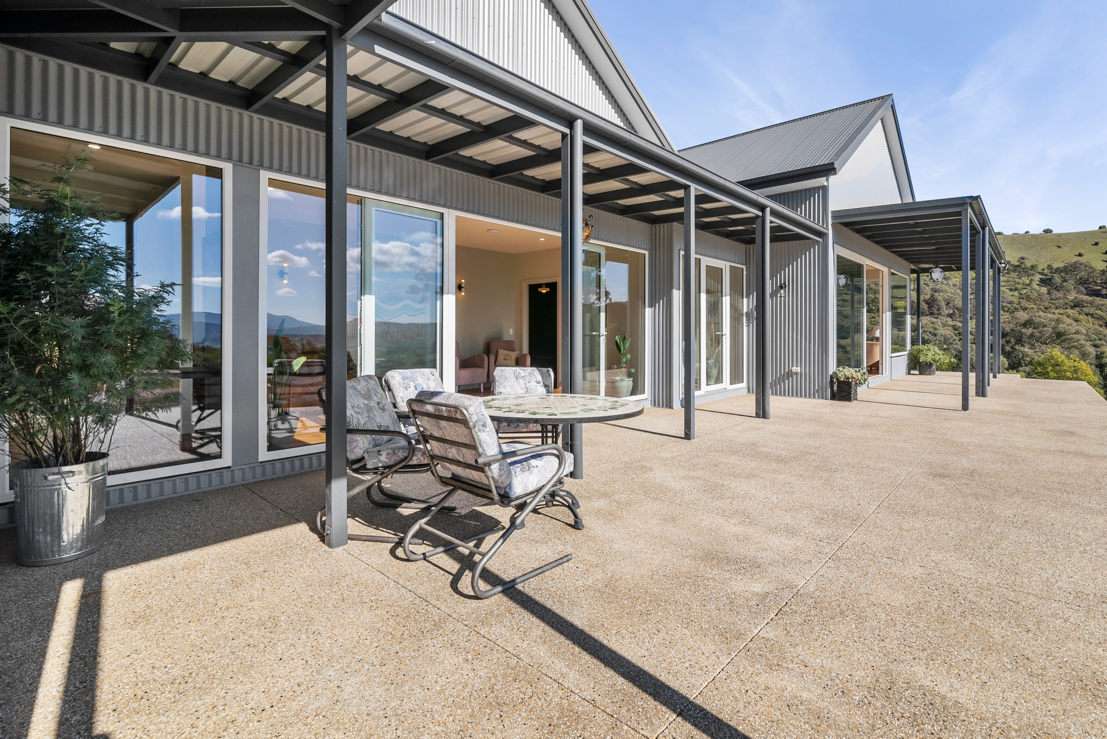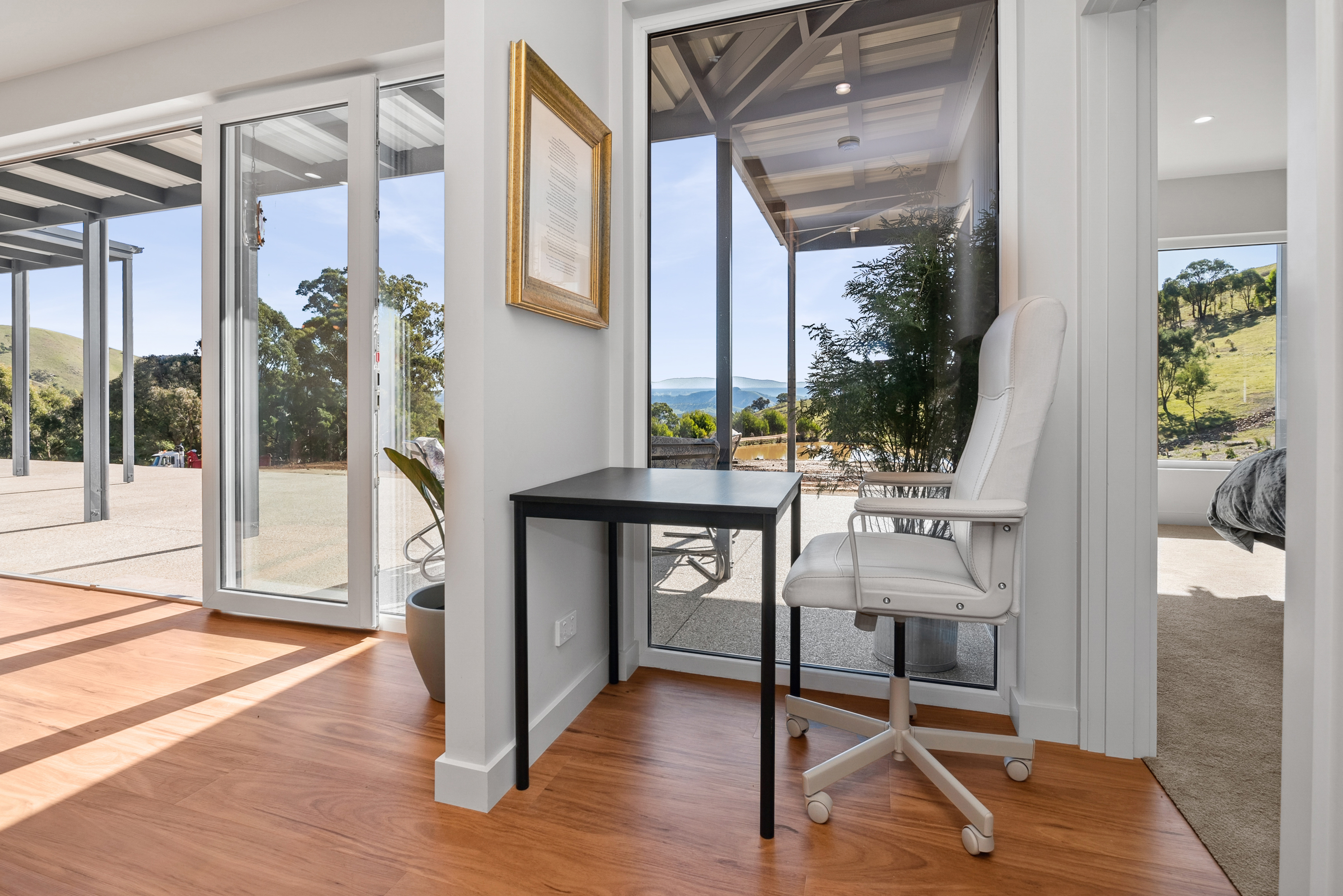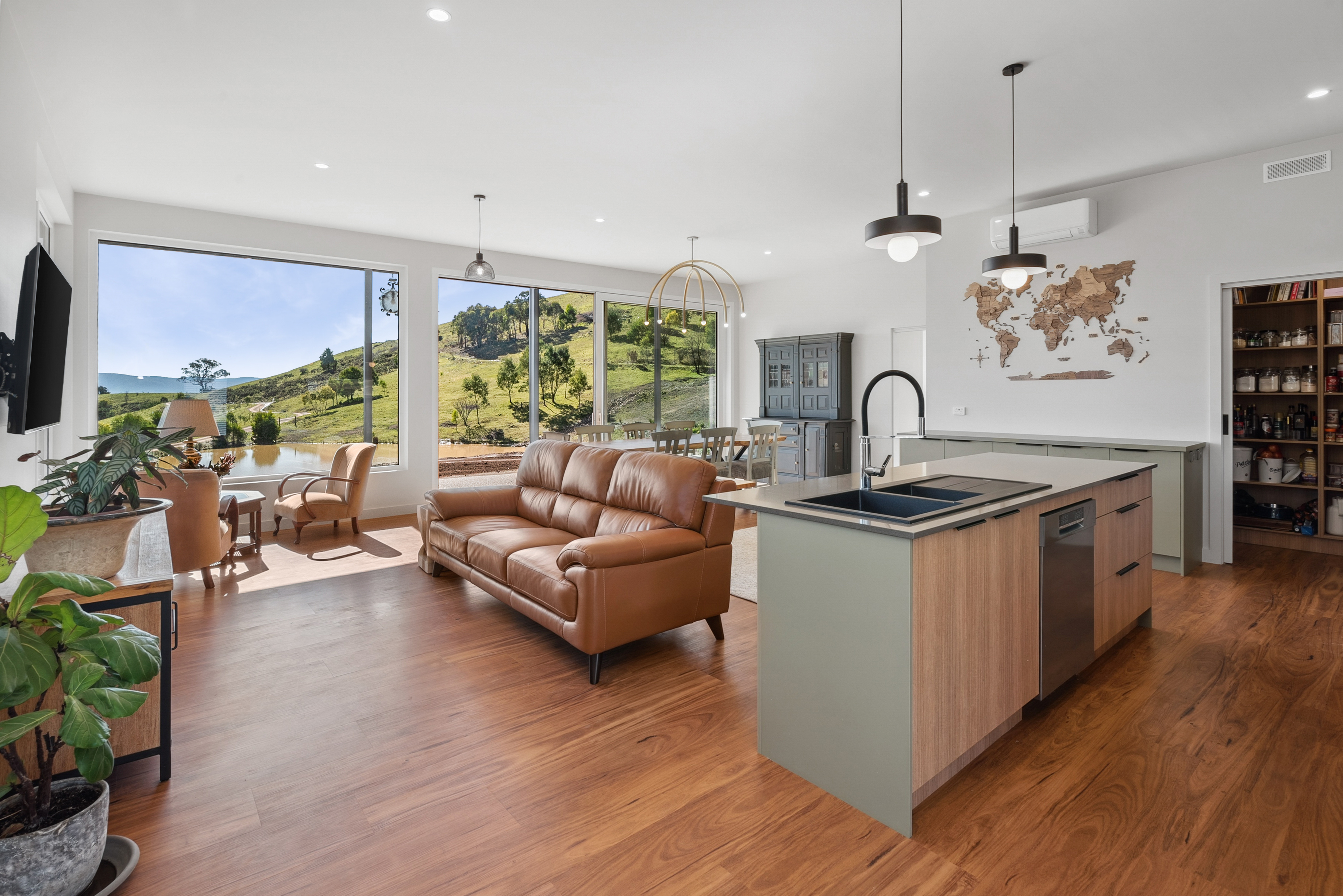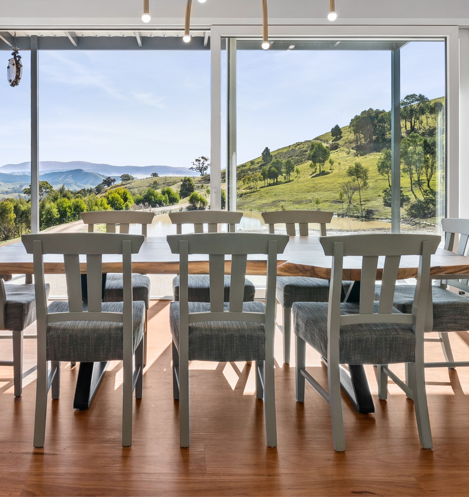 This rural house has very generous glazing to take in the views to surrounding hills. In addition to a large kitchen/ dining/ living area it has a Gallery for entertaining guests which opens on to a north facing court sheltered from south, east and west winds by the pavilion form of the building.