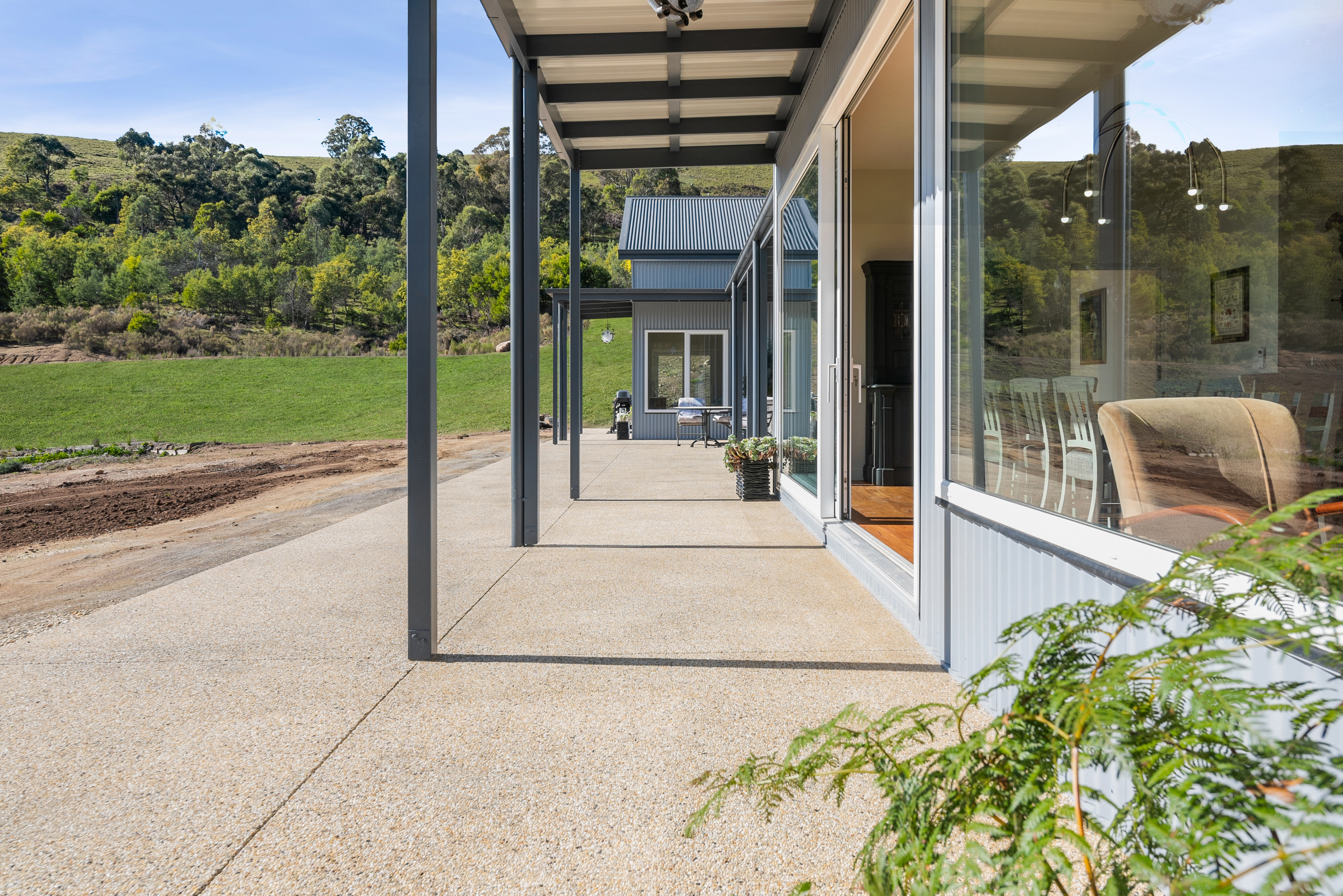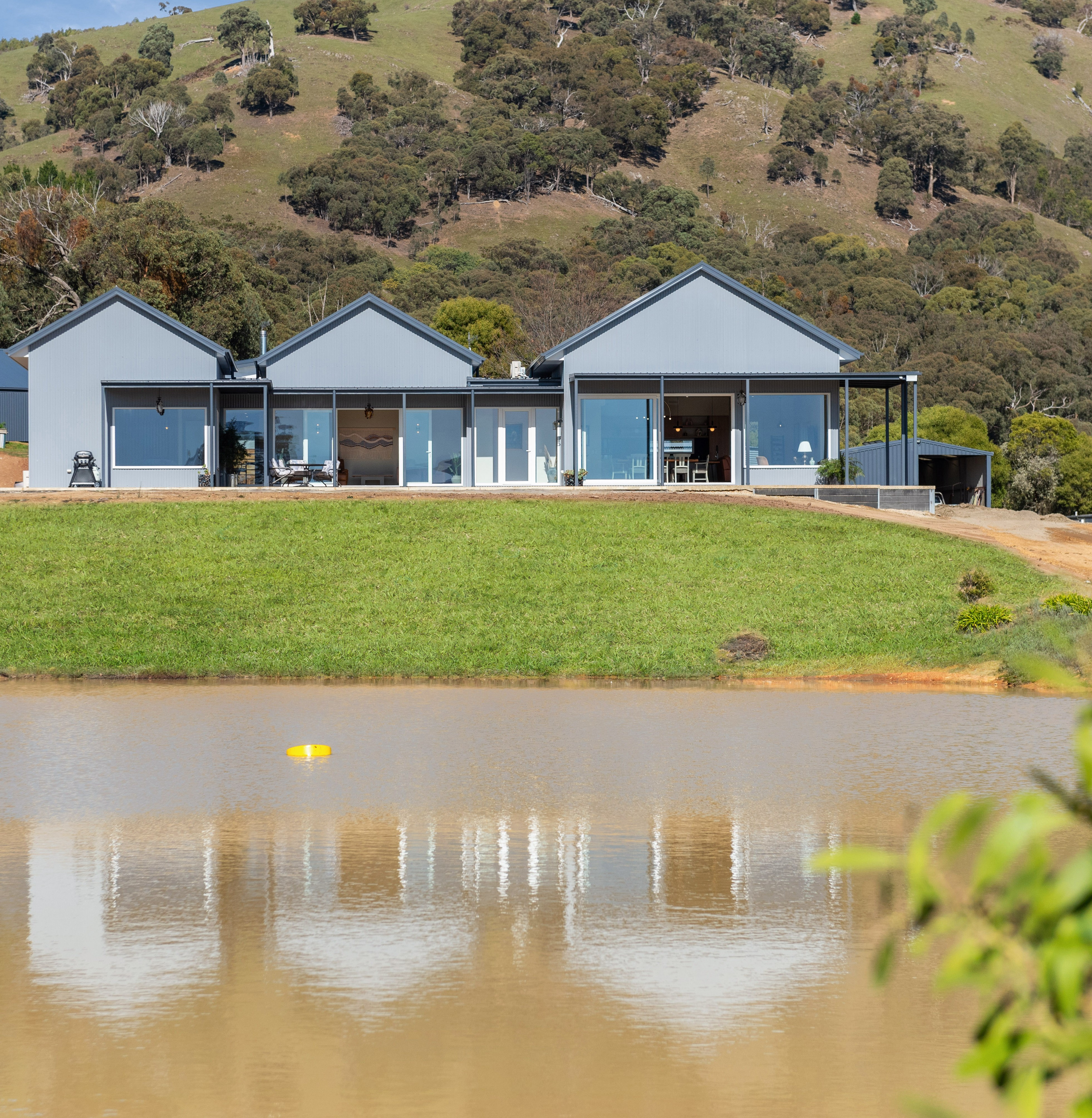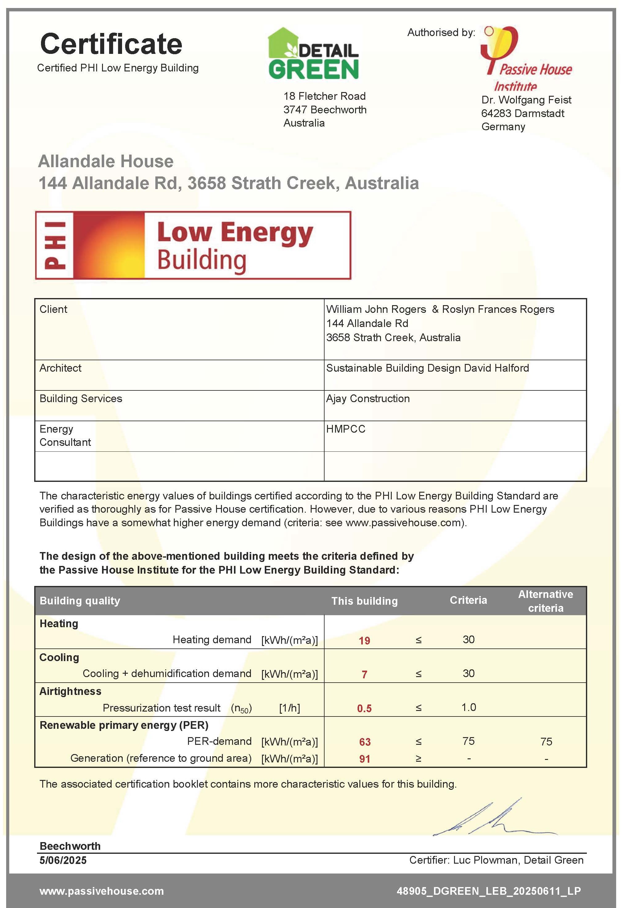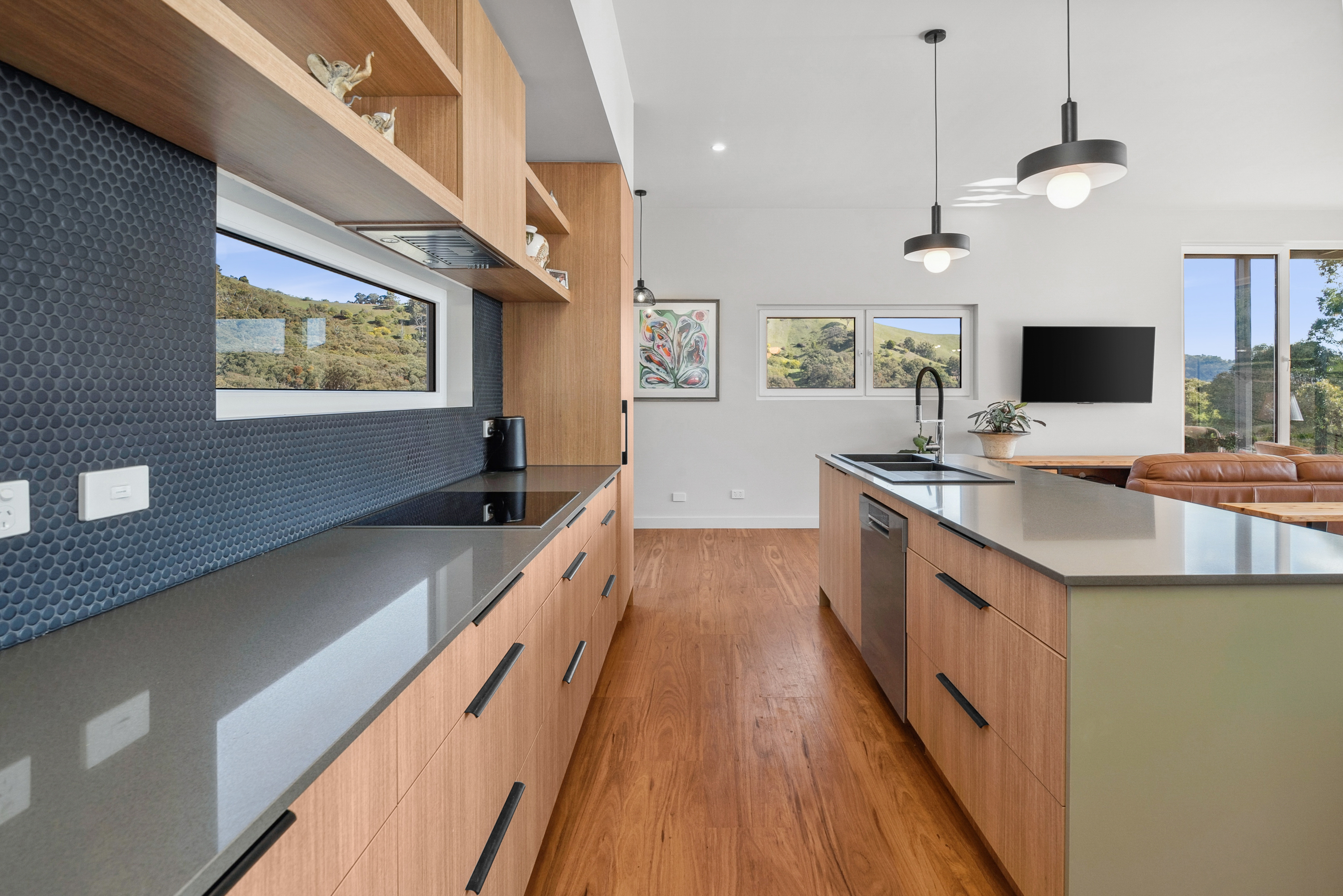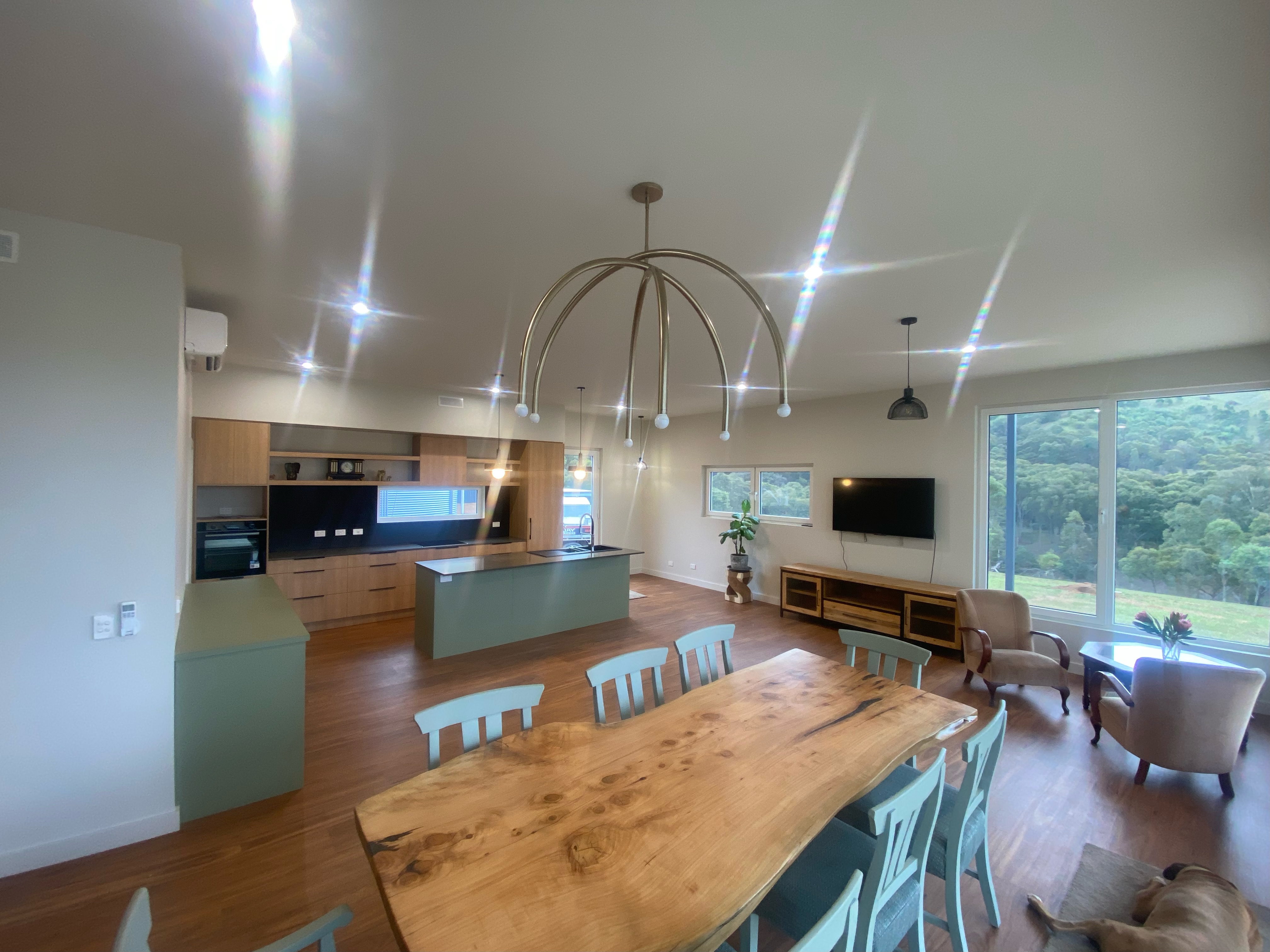 Various types of construction were investigated but ultimately the local builder preferred standard 90mm timber frame with SHD glasswool between the studs. To compensate, the roof has R10 glasswool which only adds a few thousand dollars over using Australian Code standard. The floor has a particleboard deck over insulation above the slab. Windows are double glazed Kommerling Upvc from Blue Sky. Due to the remoteness of the site, the house is totally off-grid.