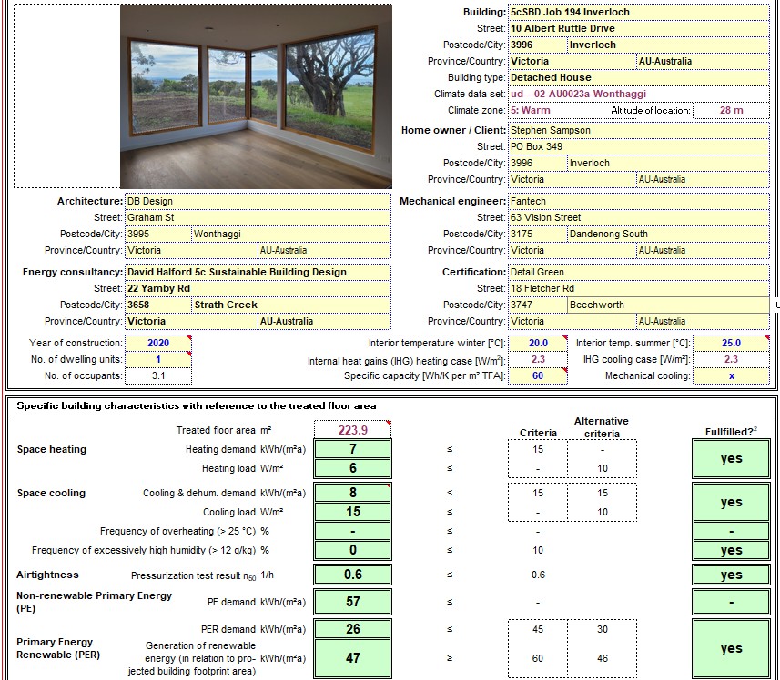 The original owners have had to move before the PH Certification was completed but the latest PHPP calculations and the agent’s sale particulars are shown below.